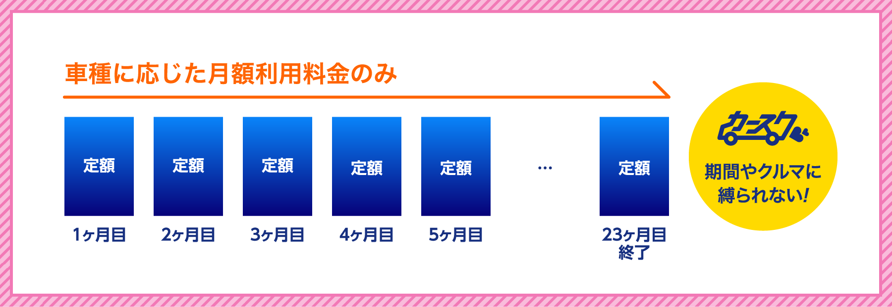 カースクは利用開始時に頭金や初期費用、税金などのまとまった資金は必要ありません。最短1ヶ月で解約が可能で、カーリースのように解約時の解約金や残価精算も一切不要です。